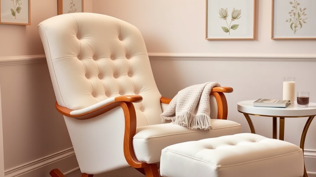 When choosing a nursery rocking chair, making sure it complements your room’s decor can turn a functional piece into a beautiful focal point. I look for a design and color that blend seamlessly with the existing nursery style, whether modern, classic, or transitional. The fabric and upholstery should match the room’s color palette and feel comfortable to the touch. I pay attention to the chair’s shape and detailing to guarantee they enhance the room’s visual harmony without clashing with other furniture. Additionally, selecting a finish that aligns with the nursery’s furniture—like matching wood tones or coordinating painted surfaces—helps create a cohesive look. Ultimately, the right aesthetic choices make the nursery inviting and stylish while remaining functional.