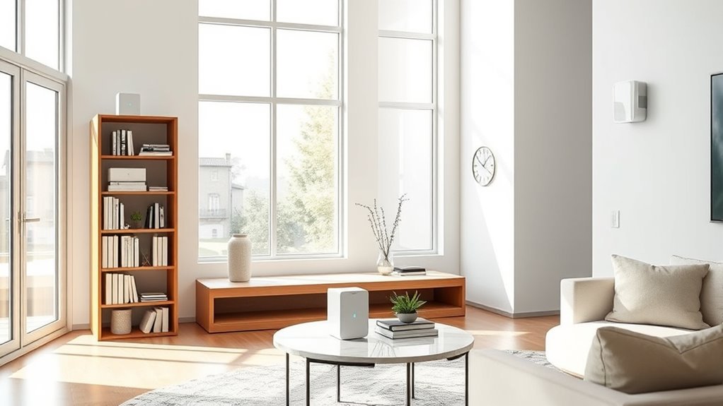 Choosing the right multi-room Wi-Fi mesh system depends heavily on your home’s size and layout. I recommend measuring your total square footage to guarantee the system can cover your entire space without dead zones. Larger homes over 5,000 sq. ft. usually need more nodes or higher-capacity systems for seamless connectivity. Check each node’s coverage radius, which can range from 1,500 to 3,500 sq. ft., to determine how many you’ll need. Open floor plans may require fewer nodes, while multi-story layouts often need more to reach all levels effectively. Also, consider systems that support wired backhaul, especially for bigger or complex homes, as this can considerably improve coverage and stability. Proper planning ensures you get a system that meets your home’s specific needs.