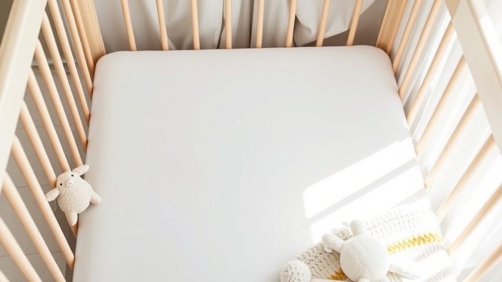 Choosing a non-toxic crib mattress starts with careful selection of safe materials that are free from harmful chemicals. I look for mattresses made with organic or certified organic fabrics and fillings, such as GOTS or OEKO-TEX standards, ensuring no toxic substances are present. Natural waterproof coatings from plant-based sources like sugarcane or food-grade silicone are excellent alternatives to chemical flame retardants. I also prioritize mattresses with hypoallergenic, chemical-free foam or innerspring cores to reduce allergy risks and chemical exposure. Certification labels like GREENGUARD Gold and CertiPUR-US are key indicators that the mattress has been tested for low chemical emissions and safety. By focusing on these materials and certifications, I can confidently choose a mattress that’s safe, non-toxic, and comfortable for my baby.