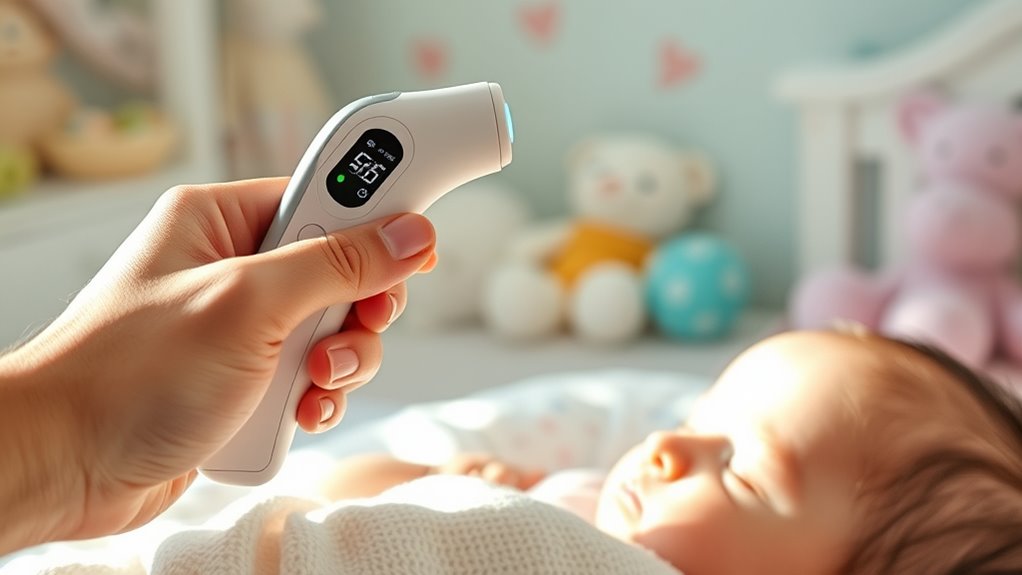 Yes, non-contact thermometers are safe for newborns. I find them especially useful because they don’t need to touch your baby’s skin, reducing the risk of spreading germs. Plus, they’re quick and gentle, making temperature checks less stressful for both of us. Just make certain you follow the manufacturer’s instructions for accurate readings. Overall, they’re a safe, convenient option for monitoring your baby’s health.