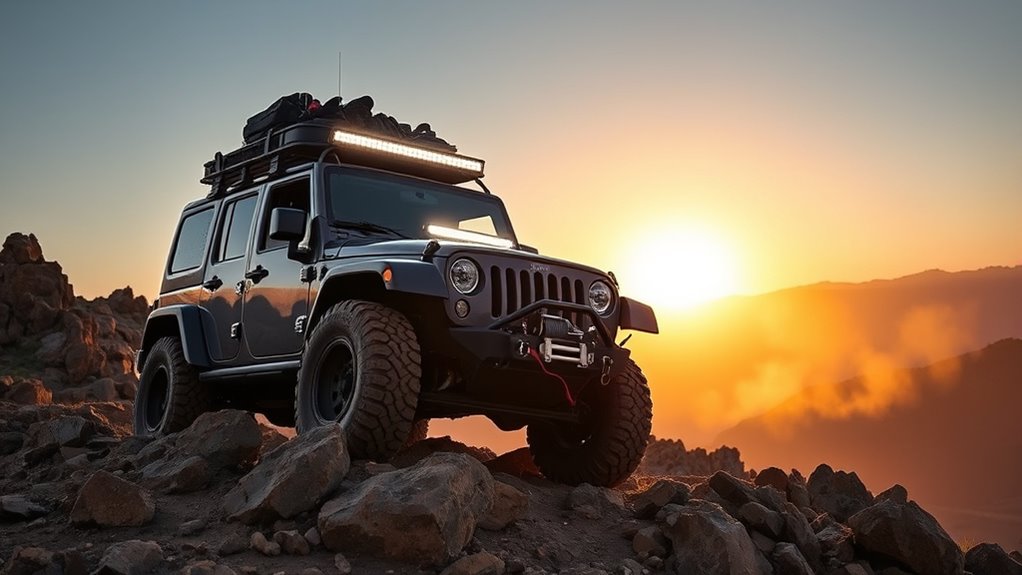 When choosing off-road accessories for different terrains, I consider the specific challenges each presents. For muddy trails, I opt for high-traction tires and snorkels for water crossings. For rocky terrain, I prioritize skid plates and reinforced bumpers. I also look at lighting for night adventures and recovery gear for tough spots. Matching accessories to terrain guarantees safety, performance, and fun on every adventure.