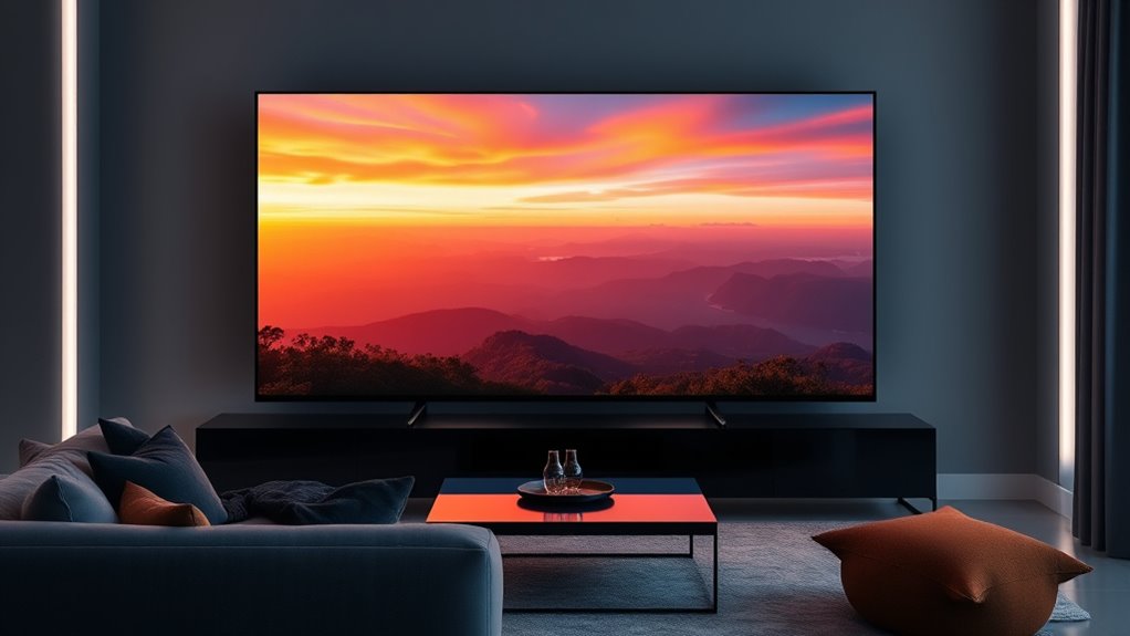 Choosing an OLED TV with superior picture quality means paying attention to several key factors that enhance your viewing experience. OLED screens feature self-lit pixels, delivering perfect blacks and vibrant colors, which boost contrast and create stunning depth. AI-powered upscaling is vital, as it refines non-4K content to near-4K quality, making every scene sharper. Advanced HDR support, like Dolby Vision and HDR10+, optimizes dynamic range for vivid highlights and deep shadows, adding realism to your content. Processing engines equipped with AI analyze scenes in real-time, adjusting brightness, contrast, and color for ideal clarity. Additionally, glare-free technology and scene analysis help maintain picture integrity in bright environments. These enhancements ensure you get the best possible picture quality, even in challenging viewing conditions.