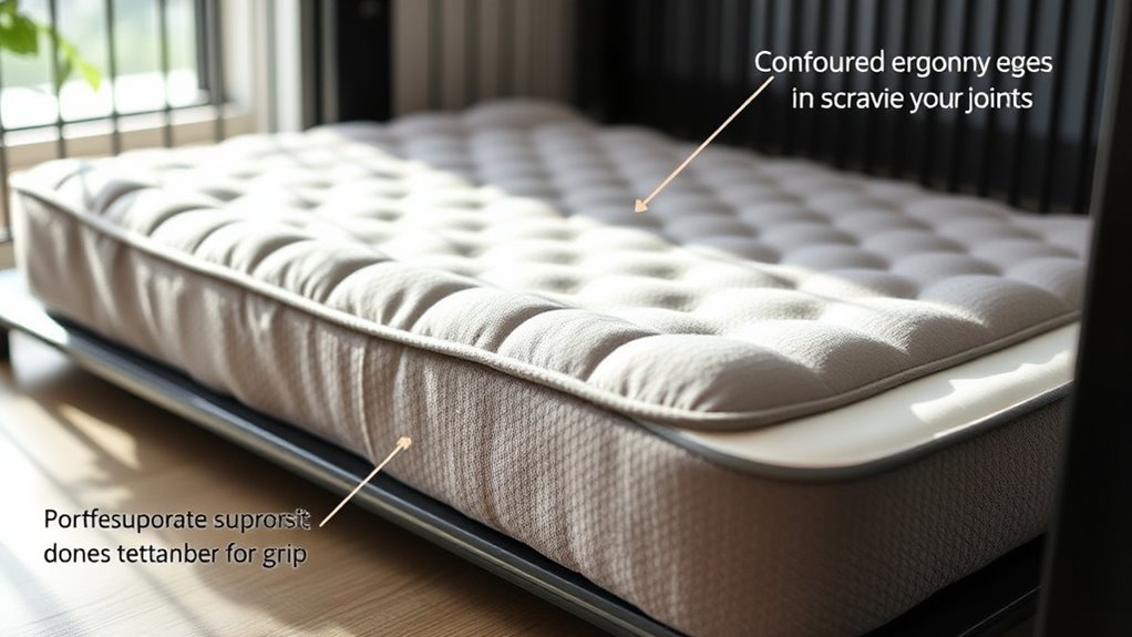 Selecting the right material for your dog’s orthopedic crate pad is essential to guarantee it offers both comfort and support. I look for materials like high-density egg crate foam or memory foam because they help alleviate joint pressure and promote restful sleep. Layered designs with supportive cores and soft covers enhance overall comfort, especially for dogs with arthritis or joint issues. Breathable, moisture-wicking fabrics are also vital—they help regulate temperature and prevent overheating, ensuring your pet stays comfortable throughout the night. I also prioritize hypoallergenic, non-toxic materials to reduce skin irritation and allergies, particularly for sensitive or aging dogs. Plus, removable and washable covers made from soft, durable fabrics make maintenance easy, keeping the pad hygienic and cozy over time.