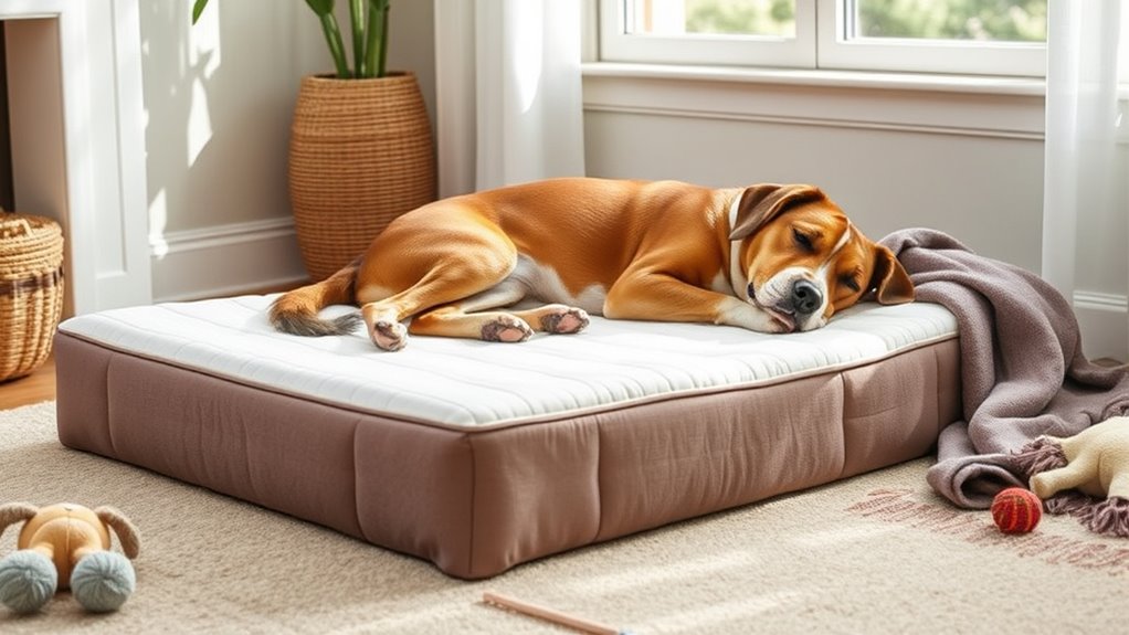 Ensuring your pet’s mattress fits properly is vital for their comfort and support. Measure your pet’s length, width, and height to find a mattress that provides enough room to stretch and move comfortably. Breed and weight are key factors; a larger or heavier dog needs a sturdier, appropriately sized mattress to prevent discomfort. Check the mattress’s dimensions, including length and width, to guarantee it matches your pet’s typical sleeping position. Also, verify that the size fits well within your pet’s crate or resting area, maintaining safety and comfort. An ill-fitting mattress can lead to discomfort or even joint issues, especially for pets with orthopedic needs. Taking accurate measurements and considering your pet’s specific size helps you select the perfect fit for their support and happiness.