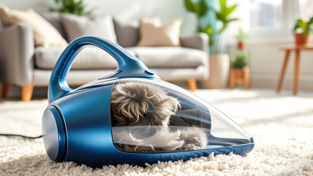 Strong suction power is vital for effectively removing pet hair that’s deeply embedded in carpets and upholstery. Higher suction levels, measured in units like inches of water lift or kPa, allow the vacuum to lift and remove hair, dander, and debris more thoroughly. This prevents pet hair from clogging filters and brush rolls, ensuring consistent cleaning performance. Adequate suction also plays a crucial role in capturing fine allergens and dust particles, especially when paired with a HEPA filter. However, it’s important to balance suction strength with proper airflow and gentle handling of delicate surfaces. A vacuum with powerful but controlled suction guarantees deep cleaning without damaging your furniture or flooring, making it an essential factor in choosing the right pet hair vacuum.