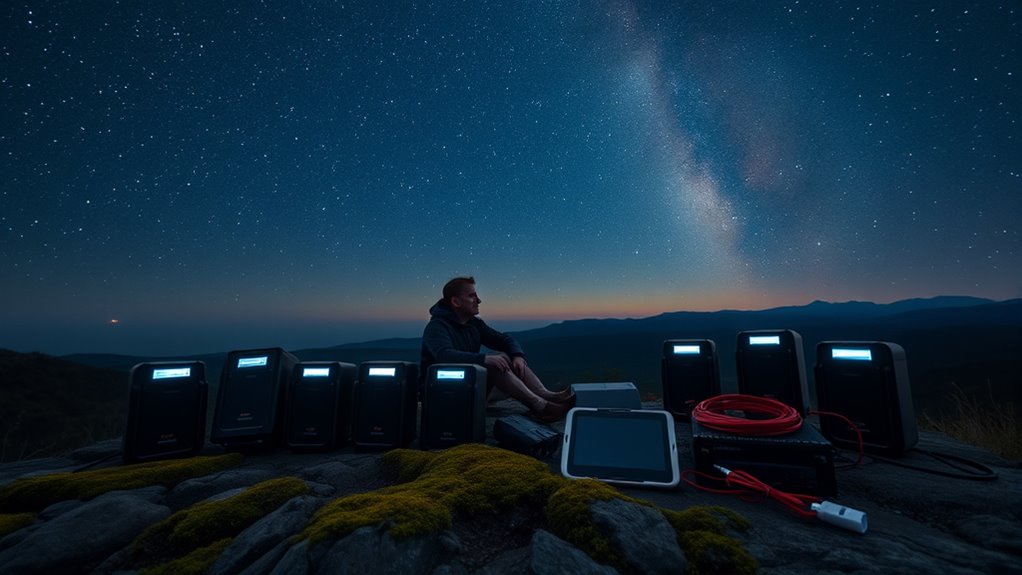 Battery longevity plays a crucial role in choosing the right portable power station for stargazing, as it determines how many times you can recharge and use your devices before the battery’s capacity declines markedly. High-quality stations often offer between 1,000 to over 3,500 charge cycles, ensuring long-term reliability. Lithium iron phosphate (LiFePO4) batteries stand out for their extended lifespan, typically exceeding 3,000 cycles, compared to standard lithium-ion options. Factors like deep discharges, operating temperatures, and charging habits can influence battery life, so proper maintenance helps maximize durability. A power station with a higher cycle count offers more recharging opportunities, making it a smarter investment for long-term stargazing adventures. Prioritizing battery longevity ensures your equipment remains powered through countless clear nights.
