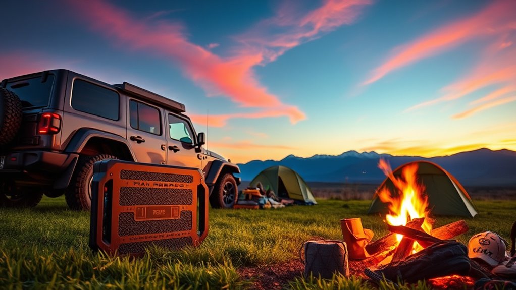 Battery lifespan plays an essential role in ensuring your portable power station stays reliable throughout your car camping trips. A longer lifespan, measured in charge cycles, means your device will perform well over many uses. Many units offer between 1,000 and 3,000 cycles, providing long-term value. Lithium Iron Phosphate (LiFePO4) batteries typically last longer and handle heat better than traditional lithium-ion options. Proper maintenance also matters—avoiding deep discharges, high temperatures, and overcharging can extend your battery’s life. Storing your power station in a cool, dry place and not draining it completely helps preserve its capacity. Choosing a model with a high cycle count and an advanced Battery Management System (BMS) can further guarantee safety and durability, keeping your off-grid adventures worry-free.