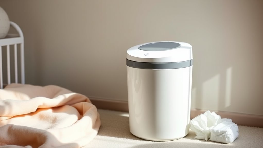 Have you ever considered how the design and aesthetics of a diaper pail can influence your nursery’s overall look? It’s essential to pick a model that complements your decor, so consider available color options and finishes. Sleek, modern finishes like stainless steel or matte coatings add a sophisticated touch and elevate the room’s style. Pay attention to the shape and size to ensure it fits comfortably without cluttering the space or clashing with other furniture. A minimalistic, stylish design can serve as a subtle decor piece, blending seamlessly into the nursery. Opt for discreet, streamlined features that don’t draw too much attention but still provide functional elegance. The right design choices make your nursery both beautiful and practical.
