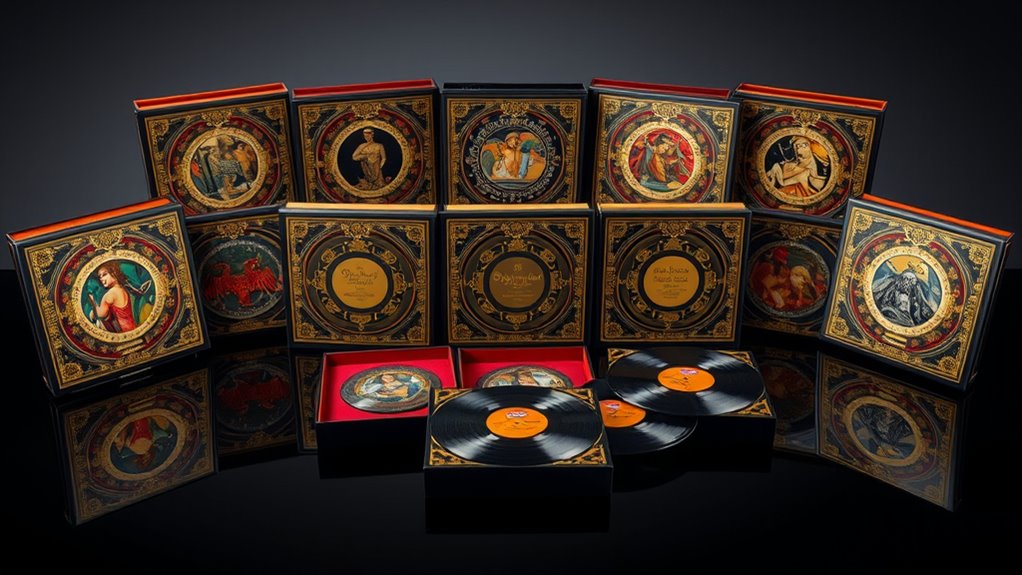 Ever wondered what sets premium collector’s edition vinyl apart regarding sound quality? It’s primarily the audiophile-grade pressing techniques that make a difference, ensuring crystal-clear sound and minimal surface noise. Many of these sets feature remastered or specially engineered recordings that preserve or even enhance the original audio fidelity. Precise pressing methods, especially for colored or translucent vinyl, help prevent distortion and maintain sound integrity. Deluxe editions often include detailed packaging with printed inner sleeves, inserts, and artwork, which complement the high-fidelity listening experience. Additionally, attention to mastering standards—like 180-gram vinyl and controlled manufacturing environments—ensures durability and superior sound reproduction. All these factors come together to create a listening experience that’s rich, detailed, and true to the artist’s original vision.