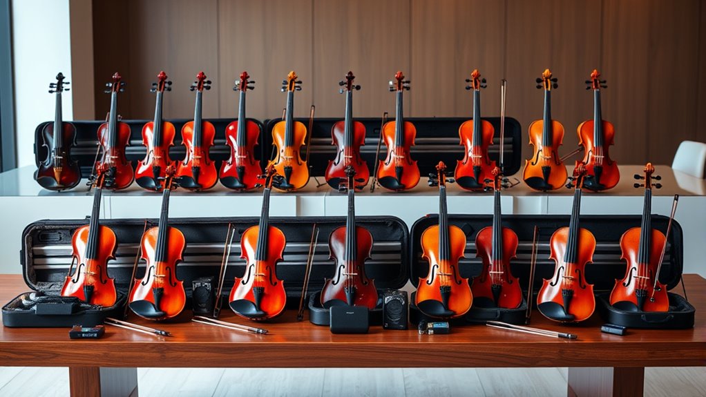 Choosing a premium electric violin starter kit with versatile practice and performance modes is essential for developing my skills and adapting to different playing environments. These kits usually feature dual modes, like silent practice with headphones and amplified sound for performances. Silent mode lets me practice late at night or in noise-sensitive spaces without disturbing others, while the amplification mode is perfect for live gigs, recordings, or group rehearsals. Most kits include adjustable tone and volume controls, allowing me to customize the sound to match my practice, recording, or performance needs. Being able to switch smoothly between silent and amplified modes helps me develop versatility as a musician. This flexibility guarantees I can practice quietly or perform confidently, no matter the setting.