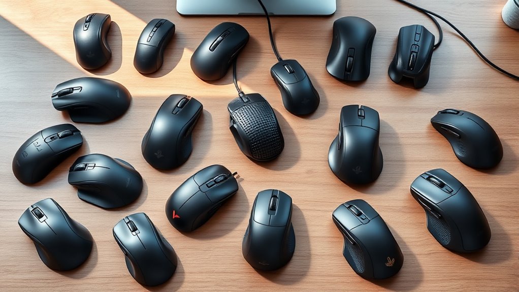 Choosing a mouse is like finding the perfect fit for a glove. I find that grip styles—palm, claw, or fingertip—directly influence my mouse choice. Palm grips need larger, more contoured mice for support. Claw grips benefit from smaller, responsive mice that allow quick movements. Fingertip users prefer lightweight, precise mice for agility. Matching your grip style guarantees comfort and accuracy during long work sessions, making every task feel effortless.