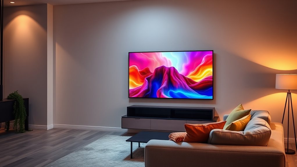 The sleek, modern designs of premium Fire TV Edition smart TVs prioritize both style and function, making them a centerpiece in any entertainment space. Their ultra-slim bezels maximize screen area, enhancing immersion. These TVs offer versatile mounting options, including VESA compatibility with patterns like 200×200 mm or 300×300 mm, ensuring easy wall installation. Their lightweight construction makes mounting and repositioning straightforward, even for one person. Additionally, thoughtful cable management features help keep your setup tidy and clutter-free. When choosing a premium Fire TV, consider how the design complements your room’s aesthetic and how flexible the mounting options are to suit your space. Overall, these design elements combine to create a sleek, unobtrusive viewing experience that enhances any environment.