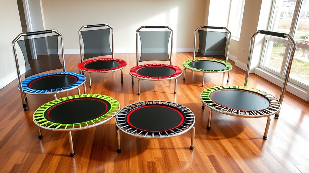 When choosing a premium fitness trampoline set, considering how easy it is to transport and store can make a big difference in your workout routine. Lightweight trampolines under 30 pounds are much easier to carry around, especially if you plan to move them frequently. Foldable designs are a game-changer, as they reduce storage space and allow quick setup and takedown. Handles or support bars that are removable or adjustable enhance portability by enabling compact packing. Smaller, around 40 inches or less in diameter, make transportation more manageable. Some models come with durable carry bags or cases, which are perfect for outdoor use or trips to the gym. These features ensure your trampoline fits seamlessly into your lifestyle without hassle.