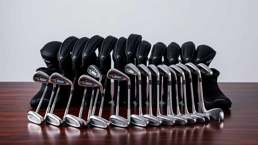Selecting premium golf club sets involves evaluating key performance features that directly impact your game. Advanced materials like forged titanium and high-quality stainless steel boost durability and ball speed. Technology such as high-speed faces, perimeter weighting, and low center of gravity helps maximize forgiveness, control, and distance. Club design plays a vital role; oversized heads and large sweet spots improve accuracy on off-center hits, making your game more consistent. Many sets include specialized clubs like hybrids and distance irons, which adapt to different course situations and enhance versatility. Additionally, enhanced alignment aids and ergonomic grips contribute to better shot accuracy and comfort during play. By focusing on these performance features, you can select a set that elevates your game and offers reliable performance on every shot.