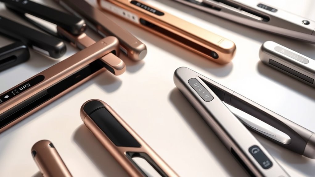 A key factor in selecting a premium hair straightener is its heat-up speed, as it directly impacts your styling efficiency. Models with quick heat-up times, often under 30 seconds, allow you to start styling almost immediately, saving valuable time. Instant heat readiness minimizes delays, making them perfect for busy mornings or last-minute touch-ups. Many high-end straighteners feature rapid thermal response technology, which adjusts the heat instantly and maintains a consistent temperature throughout your styling session. Precise temperature control often correlates with faster heat-up times, helping you reach your desired setting quickly. This combination of speed and stability ensures you can achieve professional results efficiently, without sacrificing quality or risking damage from uneven heat. In short, fast heat-up times streamline your styling routine and enhance overall performance.