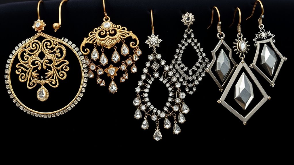 Price plays a significant role in selecting the right premium statement earrings collection, as it reflects both quality and craftsmanship. Typically, these earrings range from $50 to $200, with higher prices often indicating better materials like gold or sterling silver, and more intricate designs. Larger, more complex pieces tend to be more expensive, showcasing detailed craftsmanship. Limited edition or designer collections usually start above $200, emphasizing exclusivity and brand reputation. While budget-friendly options under $50 can still be stylish, they might use less expensive materials or plating, which may affect durability. When choosing, consider your budget and how much you’re willing to invest in quality and design. Balancing price with your style preferences helps you find an earrings collection that’s both stunning and worth the investment.