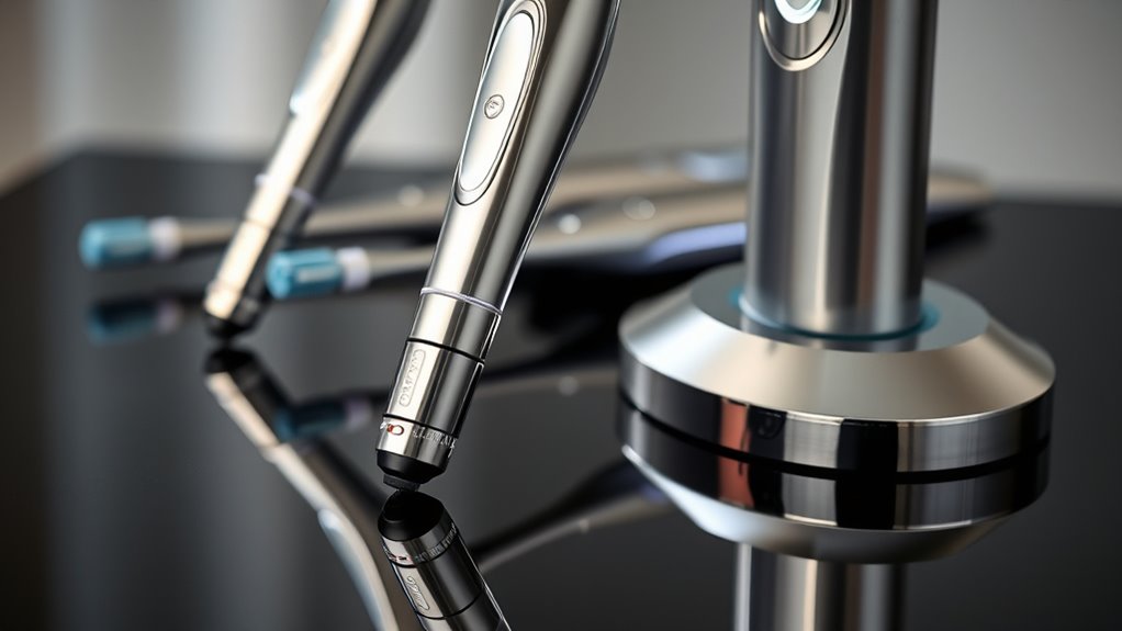 When evaluating premium whitening toothbrush systems, focusing on design and comfort is essential for an effective and enjoyable brushing experience. I look for ergonomic handles with non-slip grips, which give me better control and comfort, especially during longer brushing sessions. Slim, lightweight designs help reduce hand fatigue and make it easier to reach all areas of my mouth without strain. Rounded brush heads with soft bristles ensure gentle yet thorough cleaning, minimizing gum irritation. I also pay attention to handle material quality—durable, water-resistant materials are a plus. Ultimately, aesthetically pleasing finishes like matte or satin textures enhance the overall experience and motivate me to brush regularly. These factors combined make for a more comfortable, effective, and satisfying dental routine.