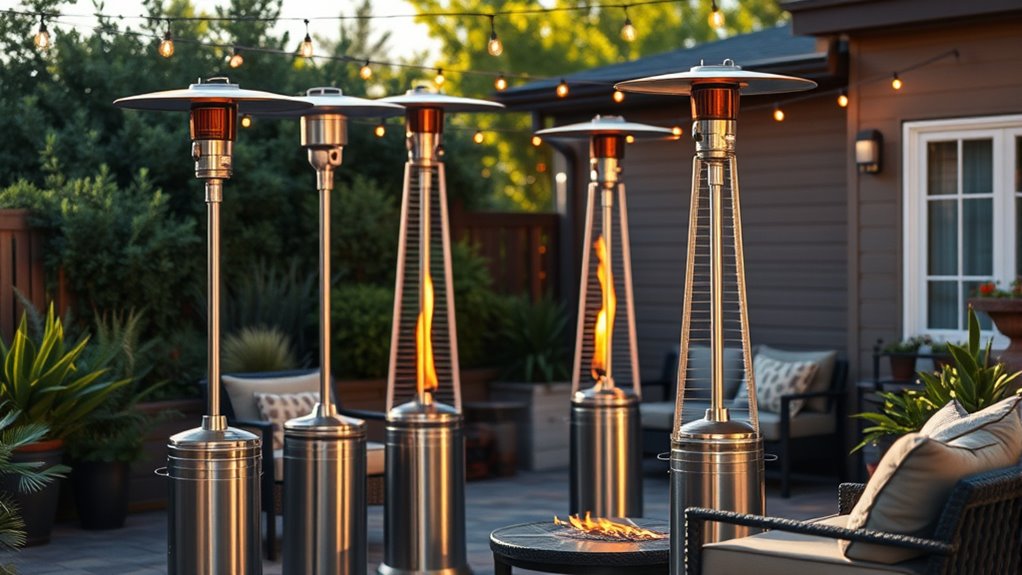 Choosing the right propane patio heater involves considering its safety shutoff mechanisms, which are essential for preventing accidents and ensuring peace of mind. Tilt switches are common; they activate if the heater tips over, stopping gas flow and reducing fire risk. Flame-out protection automatically cuts off gas if the flame extinguishes unexpectedly, preventing dangerous gas buildup. Overheat protection features shut down the heater when internal parts reach unsafe temperatures, protecting both the device and users. Some models include automatic shutoff valves that respond to irregular gas flow or pressure fluctuations, ensuring safe operation under varying conditions. The most advanced heaters combine multiple safety features, like tilt sensors and flame-out systems, providing thorough protection. Evaluating these mechanisms helps me select a heater that’s both effective and safe for outdoor use.