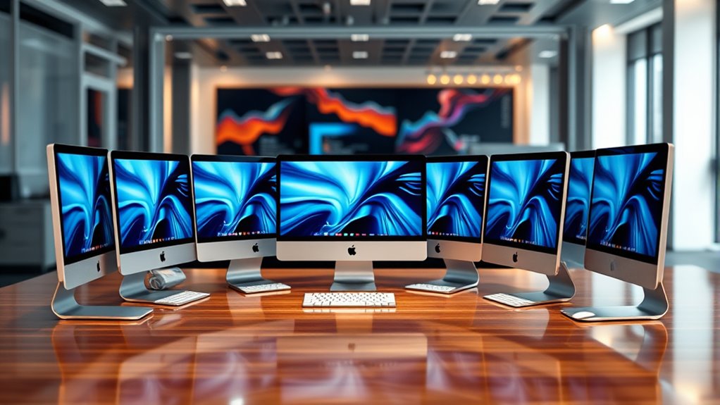 If you’re after the best renewed Mac Studio desktops for power and performance in 2025, I’ve got you covered. These models feature the latest M4 Max and M4 Pro chips, offering robust processing, high-end graphics, and ample RAM for demanding tasks. They come with stunning Liquid Retina XDR displays, plenty of connectivity options, and durable designs suitable for professional workflows. Keep exploring to discover which renewed Mac Studio best fits your needs and budget.