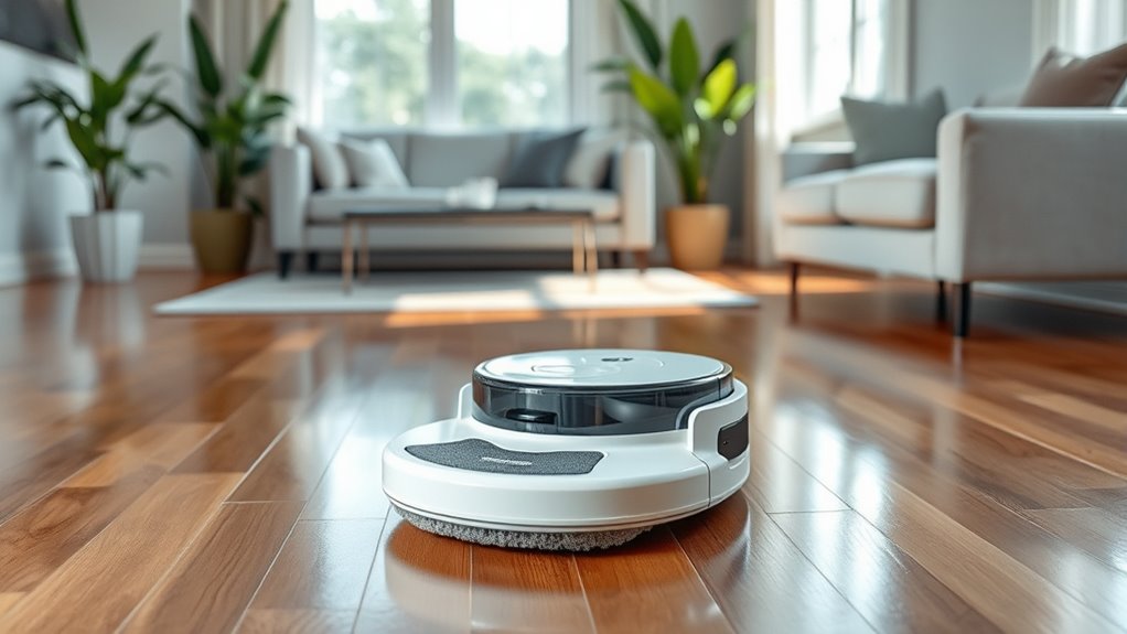 When it comes to pet hair and dander, I find robotic mops with powerful suction and rotating brushes work surprisingly well. Imagine a busy household with shedding pets; these mops can pick up hair from carpets and hard floors, reducing allergens. I’ve noticed my floors look cleaner and dander is markedly less, especially with models that have HEPA filters and multiple cleaning modes. They make managing pet hair effortless.