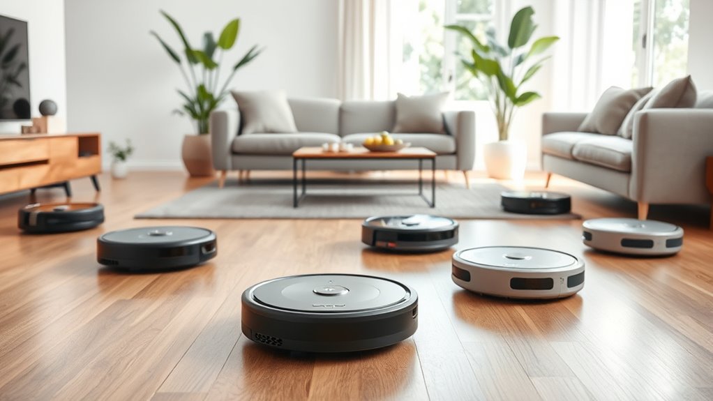 If you’re looking for the best robotic vacuums of 2025, I’ve found top options that combine powerful suction, smart navigation, and convenient features. From ultra-slim models that fit under furniture to advanced self-emptying stations, there’s something for every need and budget. Whether you want thorough cleaning, mopping capabilities, or app control, these picks deliver. Keep exploring to discover which models stand out for their performance and user-friendliness.