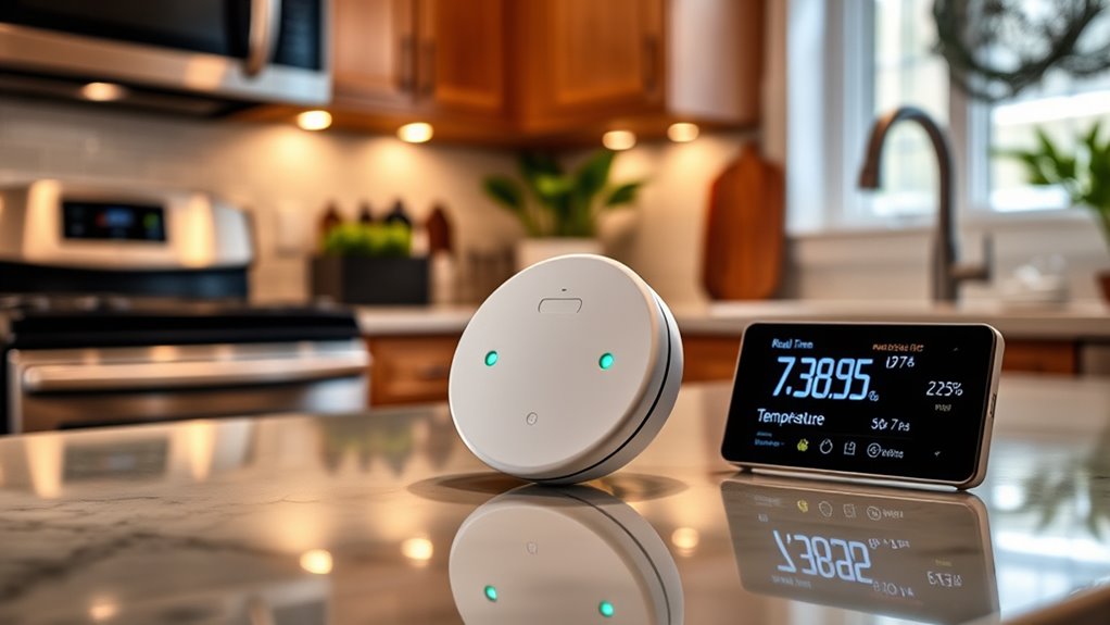 When choosing a smart leak detector with temperature alerts, I consider how sensitive the sensors are to detect small leaks early. I also check if it’s compatible with my existing smart home systems and how customizable the alerts are. Finally, I look at how easy it is to install and the reliability of its power source to guarantee consistent protection.