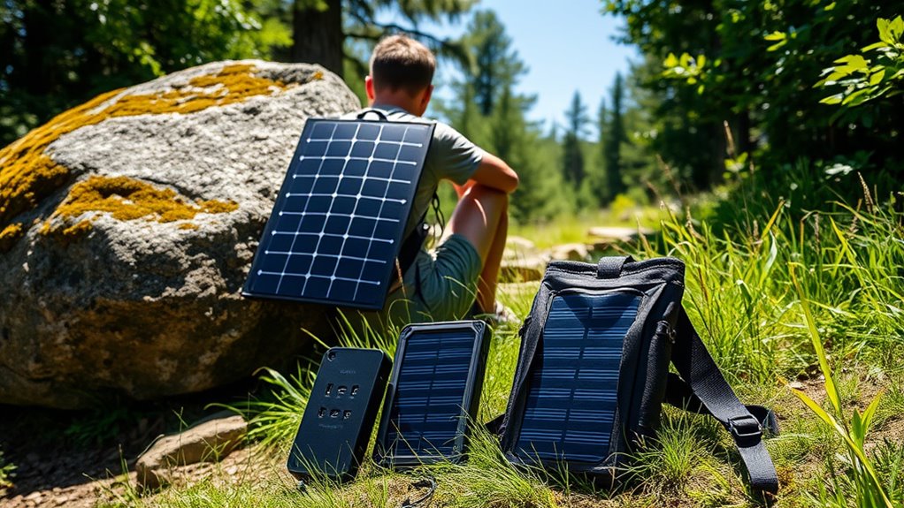 Ever wondered how quickly a solar backpack charger can power up your devices? The key factor is its charging efficiency rate, which shows how well it converts sunlight into usable energy. A higher efficiency percentage means faster charging and better performance in limited sunlight. Chargers with efficiency rates above 20% are considered highly effective for camping, especially when you need quick power on the go. Keep in mind, environmental factors like shading, angle, cloud cover, and temperature can impact efficiency, so positioning matters. Monocrystalline silicon panels typically offer higher efficiency compared to polycrystalline or thin-film options. Ultimately, a higher efficiency rate guarantees you get the most out of your solar charger, making it a critical consideration for extended outdoor adventures.