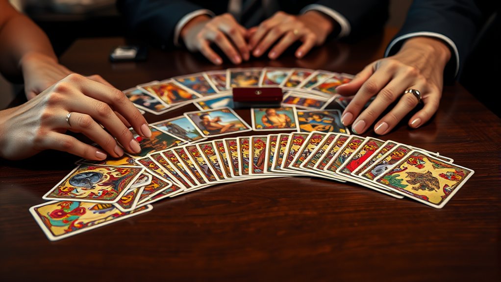 Selecting a strategy card game isn’t just about how long it takes to play; understanding its complexity helps guarantee everyone can enjoy it. I look at how simple or intricate the rules are—whether they can be learned quickly or require deep strategic planning over time. The number of rules, card interactions, and game phases give clues about potential confusion and learning difficulty. I also check if the game provides clear instructions or helpful resources like tutorials or reference cards, which make onboarding smoother. Striking the right balance between depth and accessibility is key—challenging enough to keep players engaged but not so complex that newcomers feel overwhelmed. This ensures the game is rewarding without sacrificing enjoyment or inclusiveness.