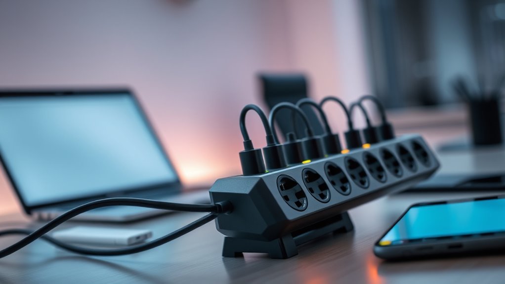 Choosing the right surge protector hinges on understanding its surge protection capacity, which is measured in joules. This rating indicates how much energy the device can absorb before it fails. A higher joule rating means better protection against power surges and voltage spikes. For sensitive electronics like computers and servers, I recommend a surge protector with at least 2000 joules. It’s important to match the surge capacity to your devices’ power demands to ensure they’re adequately protected. Keep in mind that surge protectors don’t last forever; after a major surge or every few years, replacing them helps maintain peak safety. By paying attention to joule ratings, you can choose a protector that offers reliable defense against unexpected power fluctuations.