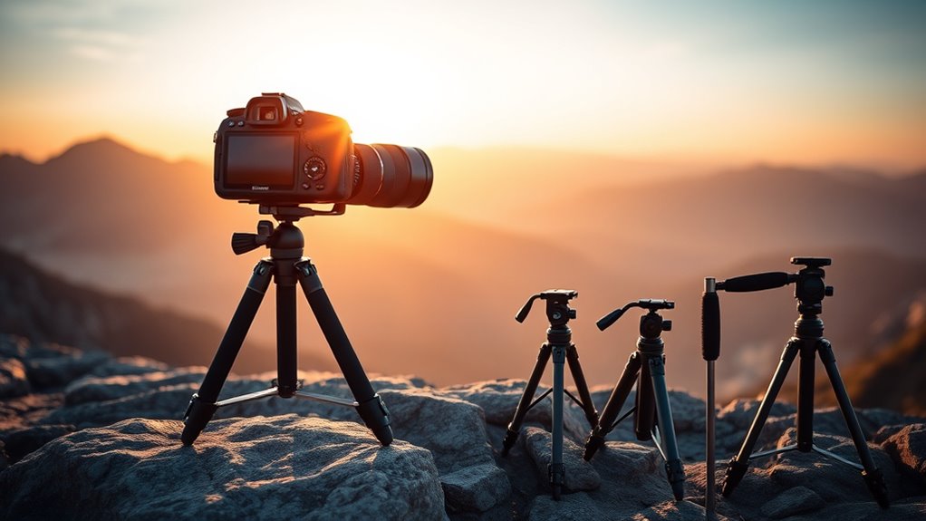 Did you know that unstable tripods can ruin over 30% of outdoor shots? To improve stability on uneven terrains, I look for tripods with adjustable leg angles and locking mechanisms. These features help me adapt to challenging ground conditions and keep my camera steady. I also prefer tripods with rubber or spiked feet, which grip better on slippery or rocky surfaces, ensuring sharp, clear images every time.