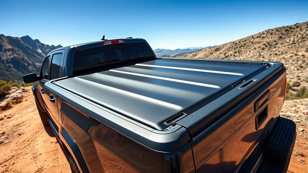 These hard-shell truck bed covers are highly weather-resistant, designed to protect your cargo from rain, snow, and UV rays. I’ve found that their sealed edges and durable materials keep moisture out, preventing rust and damage. While no cover is completely waterproof, these are among the best at resisting weather elements. Regular cleaning and inspection help maintain their protective qualities, ensuring your gear stays dry and secure in any weather.