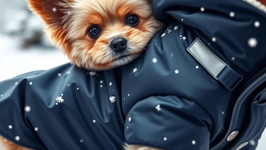 Ensuring your dog’s jacket provides adequate insulation is essential for keeping them warm in cold weather. Look for jackets with fleece or plush linings, as these materials trap heat effectively. The thickness and density of the lining directly impact how well the jacket retains body heat and prevents heat loss. Combining a waterproof outer layer with a warm inner layer is ideal for snowy or rainy conditions, keeping your pet dry and cozy. Adjustable features like elastic bands or drawstrings help guarantee a snug fit, enhancing insulation and preventing cold air from sneaking in. However, it’s important to balance insulation with breathability so your dog doesn’t overheat during active walks. Proper insulation keeps your dog comfortable, dry, and warm all winter long.