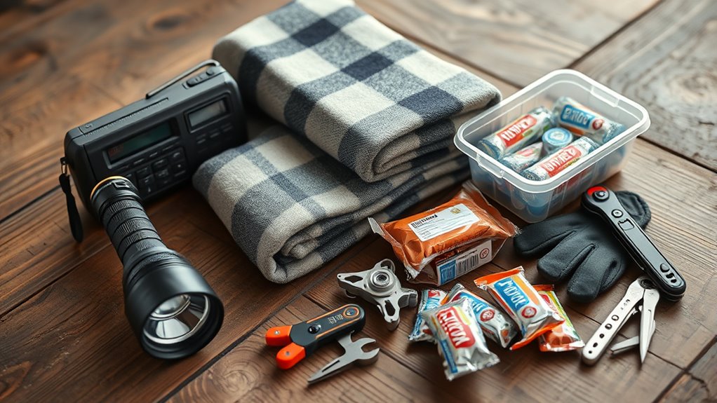 To stay safe during winter storms, I recommend having essential items like thermal and waterproof blankets, a reliable emergency kit with first aid supplies, sufficient water and non-perishable food, a weather-resistant flashlight or headlamp, warm clothing and gloves, a battery-powered radio for updates, a multi-purpose tool, a snow shovel, portable charging options, and an easy-to-access emergency plan. These basics help prepare you for most situations, and if you keep going, you’ll find even more tips to boost your readiness.